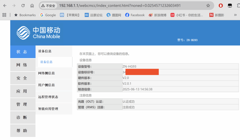 首先当然是先使用光猫背面的贴纸上面的默认帐号和密码登录到常规的光猫后台(实测不用登录):