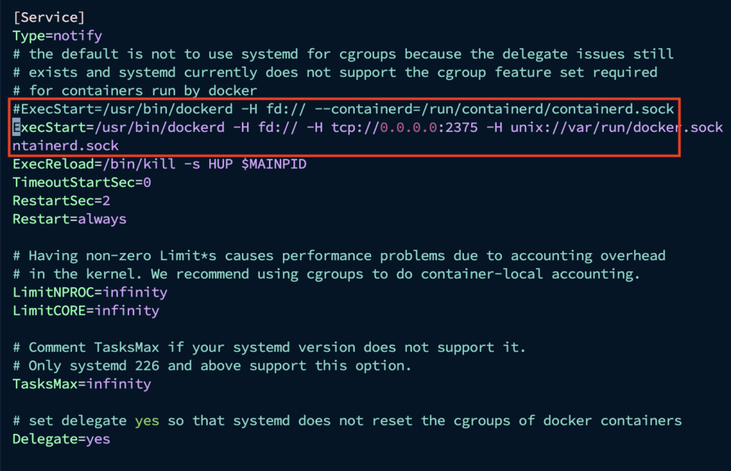 ExecStart=/usr/bin/dockerd -H fd:// -H tcp://0.0.0.0:2375 -H unix://var/run/docker.sock --containerd=/run/containerd/containerd.sock